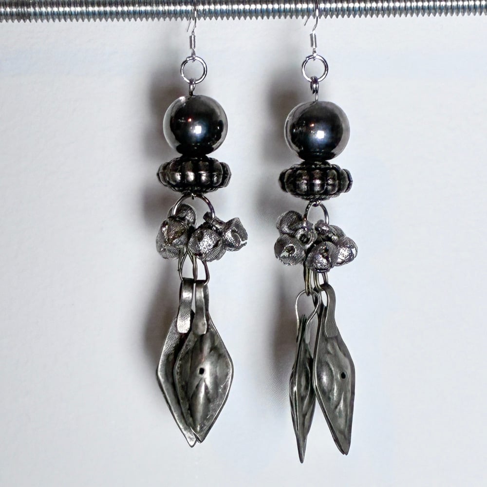 Vintage beads and pendants suspend from stainless steel posts, forming a relic-like drop that feels both industrial and ceremonial. An artifact from a wired future. A talisman for accelerated becoming.